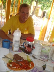 Randy enjoying a typical Mexicana breakfast: Instant coffee, Huevos Rancho a la Mexicana (Eggs with tomatoe, onion, peppers (the color of the Mexican flag is Red, white and Green) with tortillas and beans.
