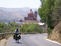 March 21, 2007 to April 7th Parral to Zacatecas Riding the high plains of northern Mexico was peaceful enough with arid high plains, scattered stunted dark colored trees like scrub oaks and what I thought was nut trees. The was little traffic and what traffic there was gave us lots of space and many waves and friendly beeps from their cars. The high plains were broken up with a few river valleys which we descended to find the area blooming with the newness of spring and planted with apple orchids, corn fields, and other cultivated fields. It turned out that the month of March is the windy season and we were greeted with varying strengths of winds through out this stretch in northern Mexico.