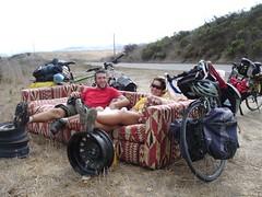 These two are idealogues. They're on the bikes because of an extreme rejection of cars; they're as green as they come and as delightfully idealistic as any young couple could ever be. They refuse to pay for a place to stay, so we never see them at the (very cheap) campgrounds at night, just along the road in the daytime. They're experts in stealth camping and free camping. They're just 19 and 25, and we are amazed to see the great adventure they've undertaken - they're going on to Mexico.