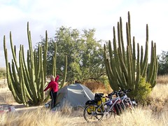 I don't think we expected the cold to follow us from Colorado, but we found out! The first day out from Phoenix was an easy day with an easy desert campsite. But the next day we got caught by the afternoon rain (and hid out in a motel). But the third day was all a gradual climb, with gradually increasing (cold) rain until we finally bailed into the desert beside the road as dusk approached. It was so cold and wet! We just huddled and tried to warm up and never did cook dinner. And in the morning I didn't ever get the courage to get up and fix the coffee like I do every morning. Nancy had to seize her role as Chief Courage Officer and get up and do all that. Finally we dragged out, and the final ride into Tucson wasn't really all that bad. But we sure hope it doesn't rain that much all the time!