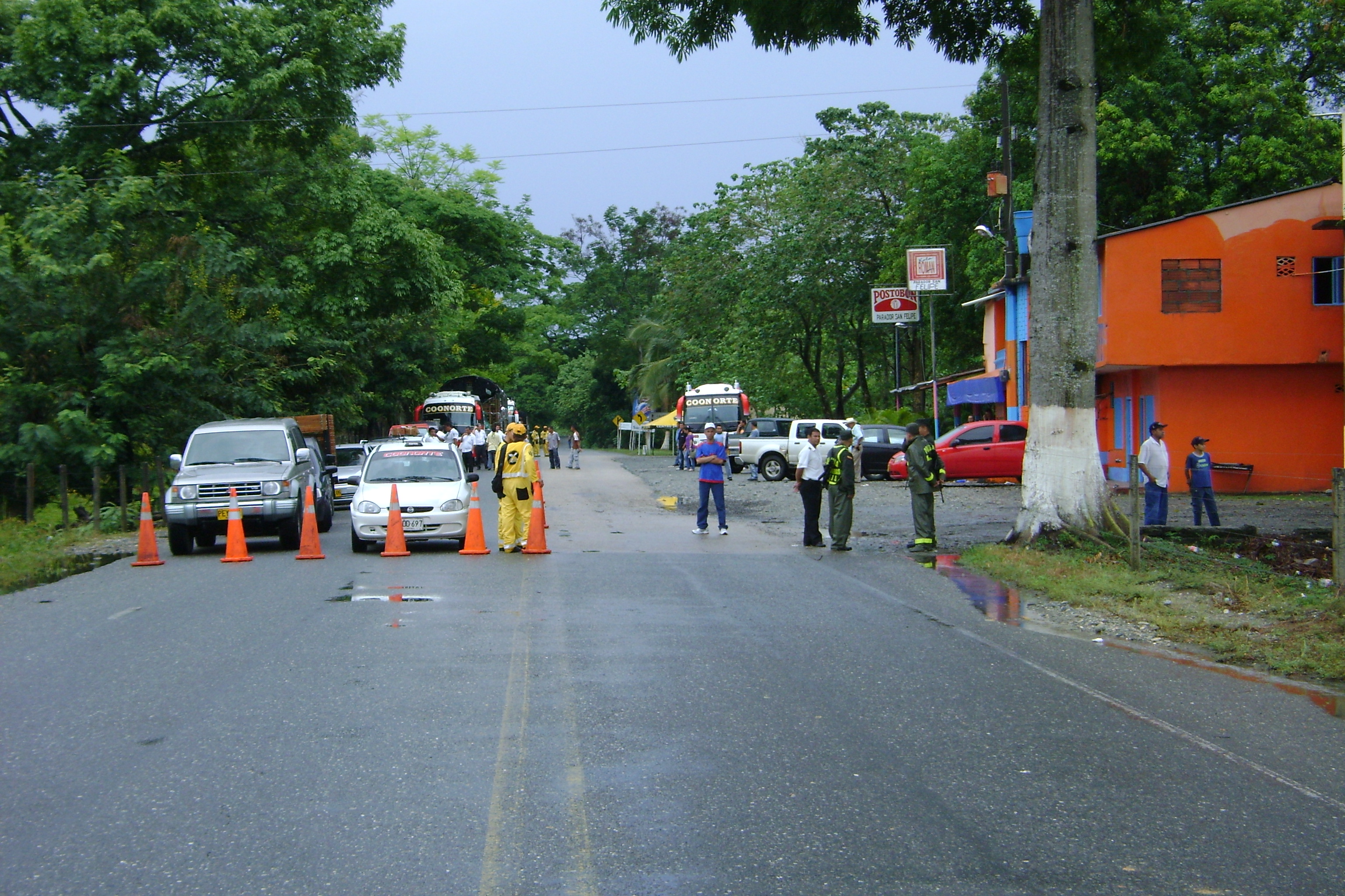 It was late in the day and the young men at the military checkpoint told us to hang it up for the day. We found a hotel for the night and continued in the safety of the daylight. I was a little tense riding through the small town that was under military control. What we found out was that two days earlier there had been a skirmish between the campesinos and the military during a protest where one person died and several were hurt. I must admit I was tense as we were waved passed the road block by the riot squad and into the small town of Taraza. I remember seeing the charred remains of tear gas, spent metal parts and burnt tires scattered through out the towns main street. It was the closest I had ever come to a war zone and I was scared. Randy jokingly said we should stop for breakfast. I said "no way" and we rode on toward a more tranquil part of Colombia. I took my first deep breath about 15 miles past the town and did not stop sweating for another 10 miles.