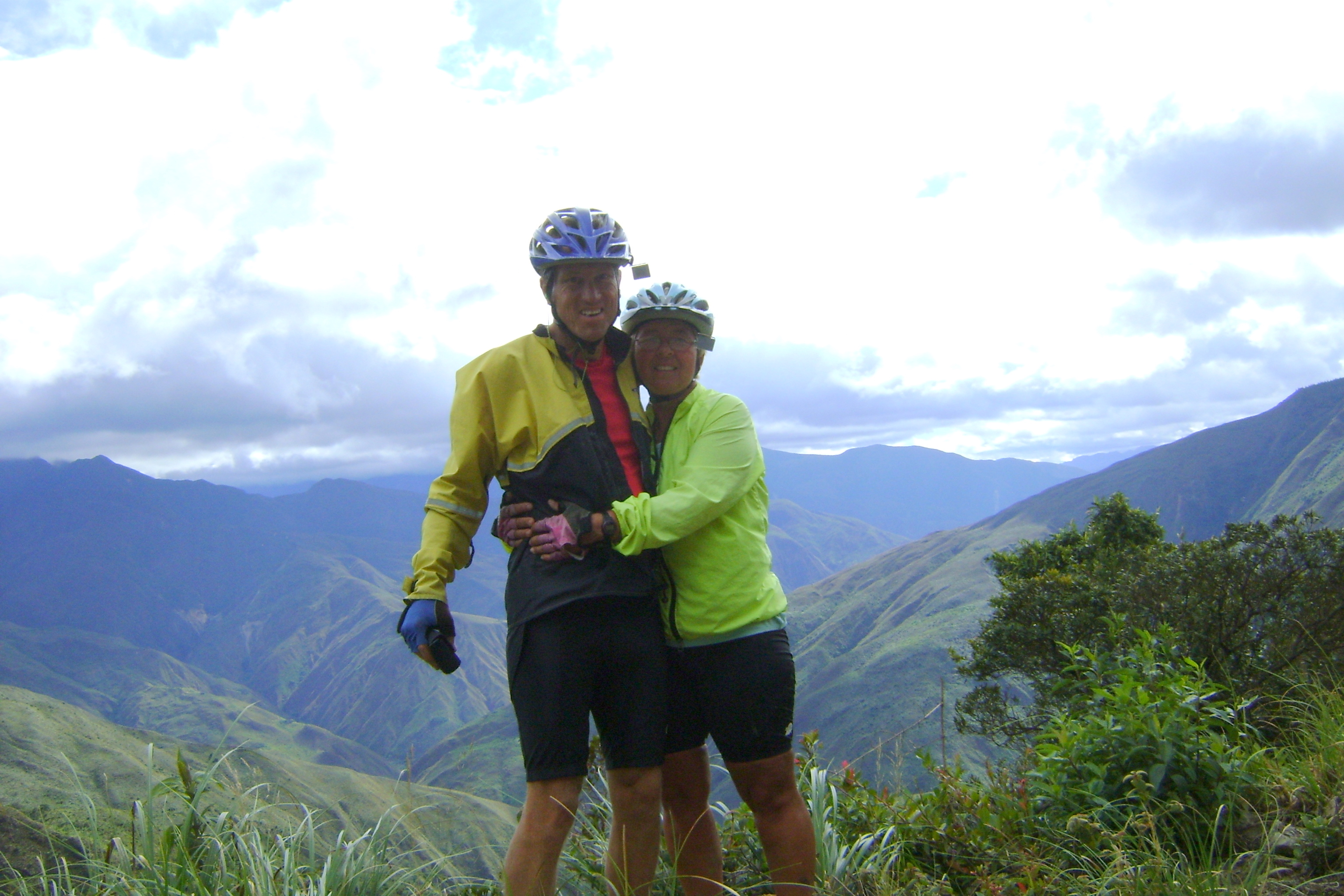 After three nights of pampering, we hopped back on the bikes and slowly rode to the Peru border. Again the steep climbs caused us to get off our bikes and push up the steep parts. The nice pavement ended after just 20 kilometers (for the next week) and the real work started. We climbed up over the continental divide somewhere in the Podocarpus National Park. The road was muddy because of the amount of rain that falls in this cloud forest. We had several stream crossings. Randy rode through them, but I changed into my sandals and walked across. Sometimes we could see foggy vistas, but sometimes the clouds limited us to views of the mossy vegetation we rode by. Tiny flowers sprung out of the cliff-hanging moss and orchids thrived in this perfect environment. We topped the climb at 2772 meters thinking we were about to descend 1000 meters into Valladolid. It was cold and windy. I dressed in all the warm clothes I had and rode hard to stay warm. We did descend just a bit, and it got a hair warmer, but it started to rain harder too.