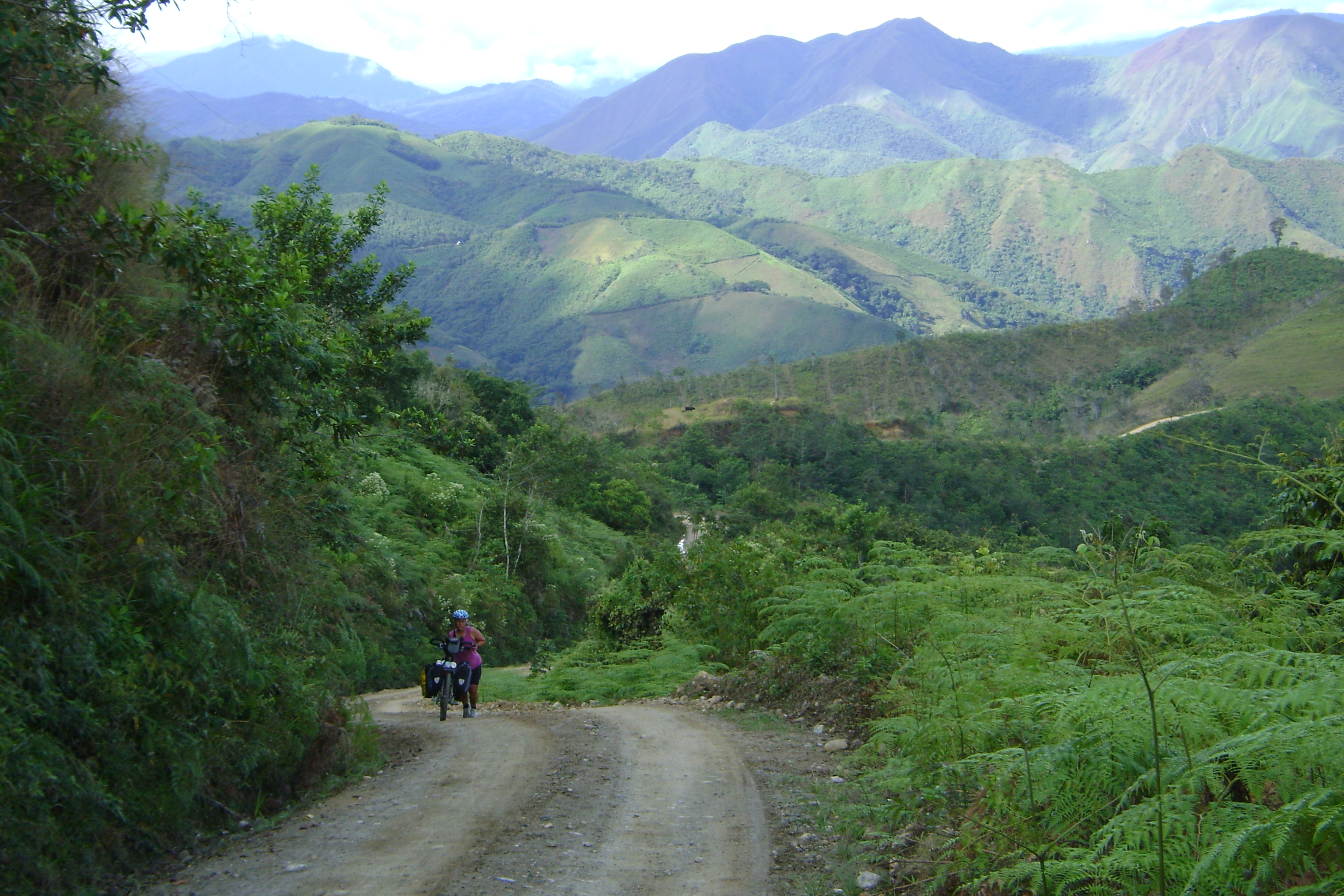 We checked into a hotel in Zumba that had a covered roof top and a washing basin. We washed the mud of all off our gear and hung it overnight to dry. The next day we set out for the Peru border. Again the climb was tough, and I walked a fair number of places that just took too much energy to ride. At the top of the biggest climb we crossed through the second military checkpoint in the area. Randy talked with the officer in charge, Hector, about our trip. He had so many questions and was truly interested in our experience. The two younger soldiers just looked on with amazement. We found out that all men in Ecuador are obligated to serve for one year. Or they can pay $40 to be exempt from service. These soldiers were stationed here for 24 hours and then had 24 hours off. They wrote down our passport information and wished us well as we climbed the last hill of Ecuador. I walked half of it.