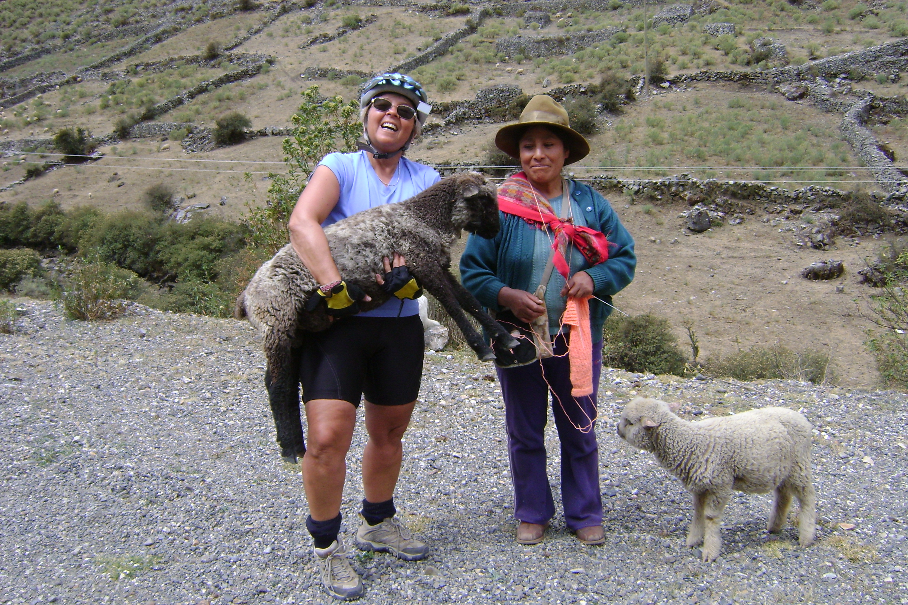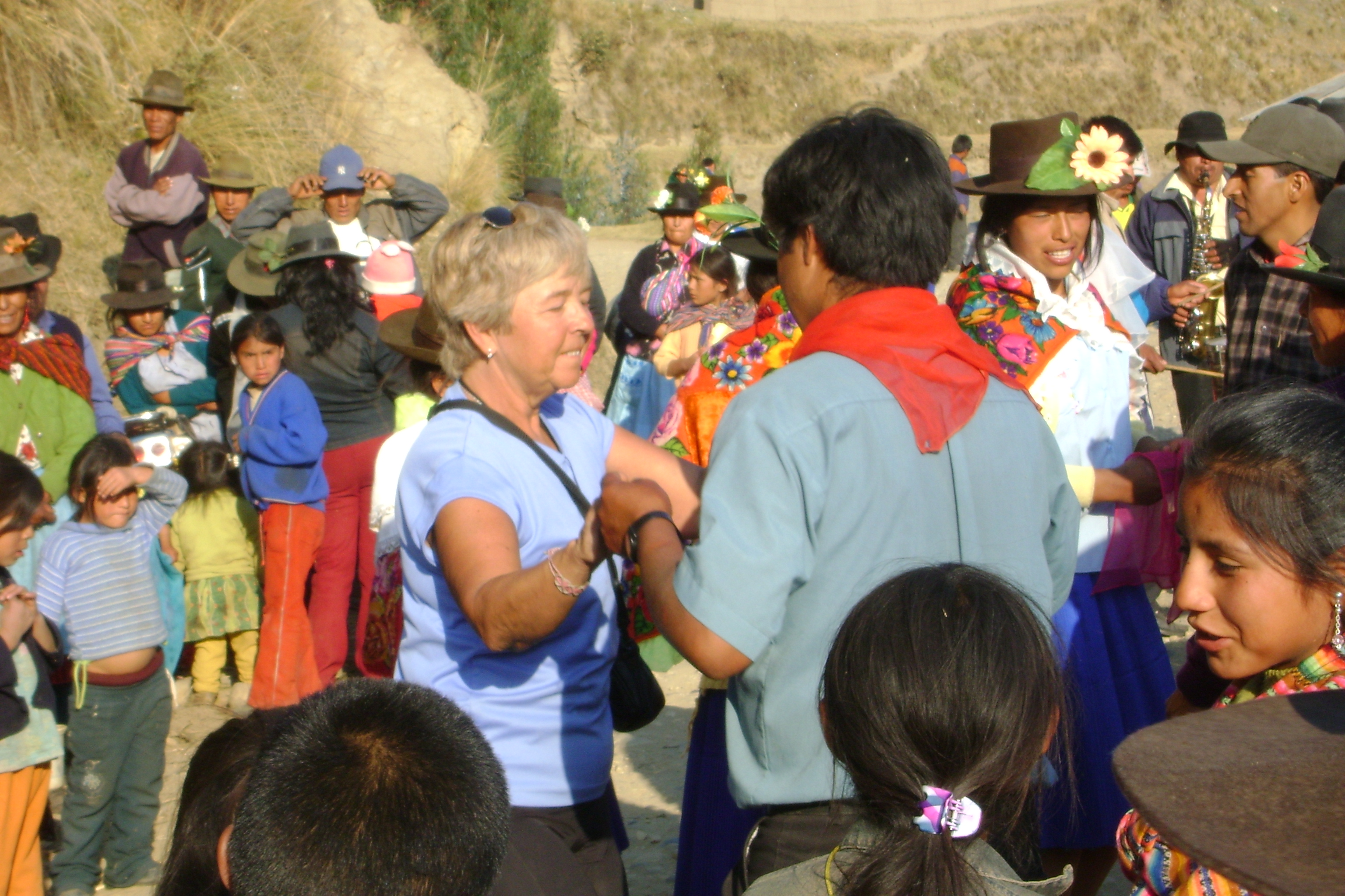 But the best part all along the way was the people we met. There were shy families along the way, tending their sheep while knitting or spinning wool into yarn. One woman let Nancy hold her most prized lamb. We ran into celebrations in three different villages. They roped us into the dancing and the eating and the drinking. It was a delight. We stayed the night camped out with a Spaniard who is "getting away from it all" with a flourish - he and a friend showed Nancy how to pan for gold - and she found a little flake of gold in the Rio Maranon! Now she's rich and can afford the rest of the trip.