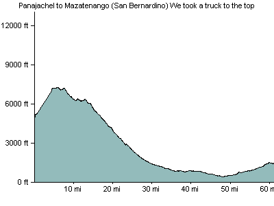 Got a ride to the top, then did the 55 miles (mostly easy) CA-2 hwy was ugly; wide, but too much traffic. Stopped in San Bernardino just outside of Mazatenango at a couple of decent hotels. Much nicer than in town.