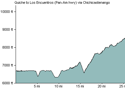 We only rode 14 miles, but it just killed us. And we took a pickup this time across the two deep canyons between Quiché and Chichicastenango (we rode them last time). We just thought discretion was the better part of valor. Even so, the canyon after Chichi and the climb following it just kicked our ****. It's steep! Maybe it had something to do with a big day yesterday too.