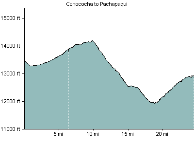 All paved, quiet road. Quick drop from the crossroads, followed by a climb to a pass at 4300 meters (new record for us) then down, then back up to Pachapaqui, where we camped behind Pepe's restaurant. Very nice people.