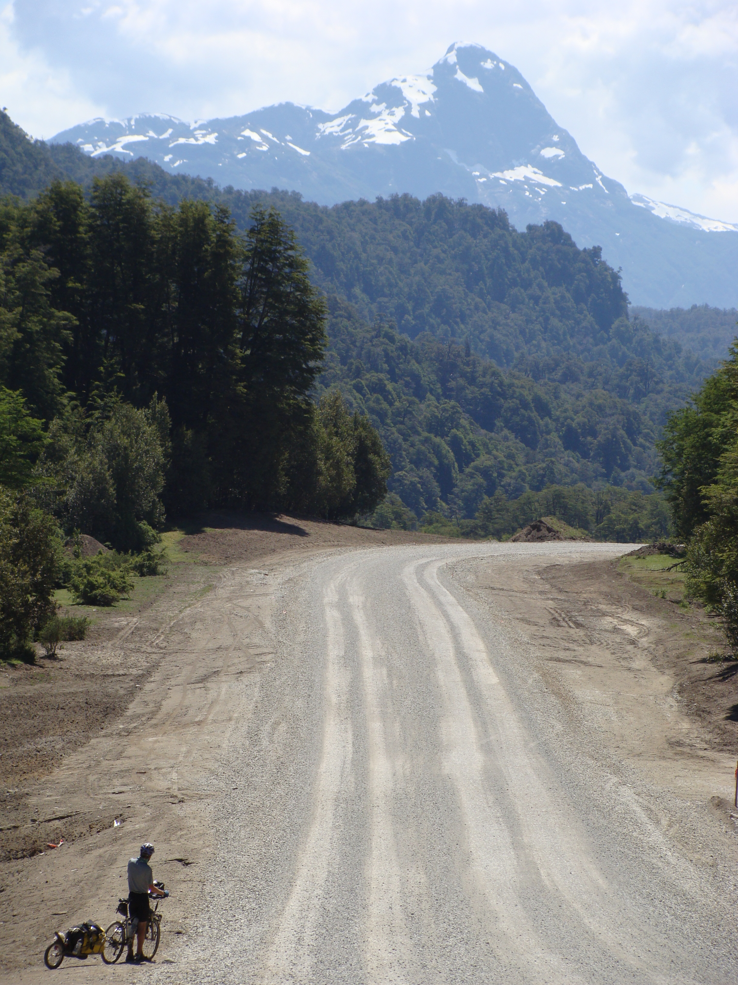 The first 40 miles were on paved road along countless pristine lakes. Rising out of the glacier waterways were the photographic Andes which reflected back onto the mirror lakes. We traveled from one National Park to another. Capturing great photos was so easy. It had all the elements which make for stunning images. Bright clear sunlight, rich blue sky, snow covered mountains, tree covered foothills, glacier-fed lakes and meadows of spring flowers. Take enough photos and one or two have to come up right. I find riding a bike a great way to explore an area and shot photography because we can stop anytime and spend as long as we want.