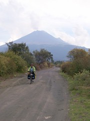 Popo (actually Popocatepetl) and Ixta (Iztaccíhuatl) are two of the three highest mountains in Mexico, at over 17,800 feet (5,400) meters, and the saddle between them is called the Paso de Cortes, and it's at 12,000 feet (3650 meters). Cortes came over this pass from Cholula (where we are tonight) to attack the Aztecs at Tenochtitlan (today's Mexico City). It's a direct route over the rim of the Valley of Mexico, but the 4,000 foot climb around a smoking volcano was a little threatening to us!