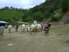The roads so far are dirt and very rough, no smooth grading like in Ecuador. However, our first road was more gentle in slope - we were able to ride all of it, with no pushing. All the culverts seemed to have been washed away or never existed. As a result we find ourselves riding through huge mud holes. One spot seemed about 50 feet long and the whole width of the road and no way around, so we were forced to ride through it. The coffee-colored mud was consistency of thick yogurt. In some places it may have been 6 inches thick. I know I could not see where I was steering. I just rode blindly, holding tight to my handle bar. I just hoped I would not slip and fall into the slop. The final section offered two deep ponds of mud. Randy told me the left hole was the better one and I should ride through it. At last, I did not have the courage or the skill to maneuver through it. I dismounted my steed and waded through the mud and around the ponds, adding to the collections of mud I had been accumulating all day. When I got to the other side, I looked back and saw I had an audience watching us with our fully loaded bikes making our way through the river of mud. I wonder if they had made bets if we would make it through or wipe out.