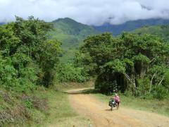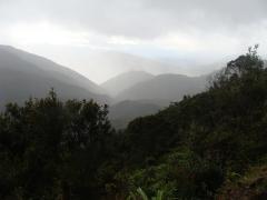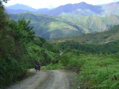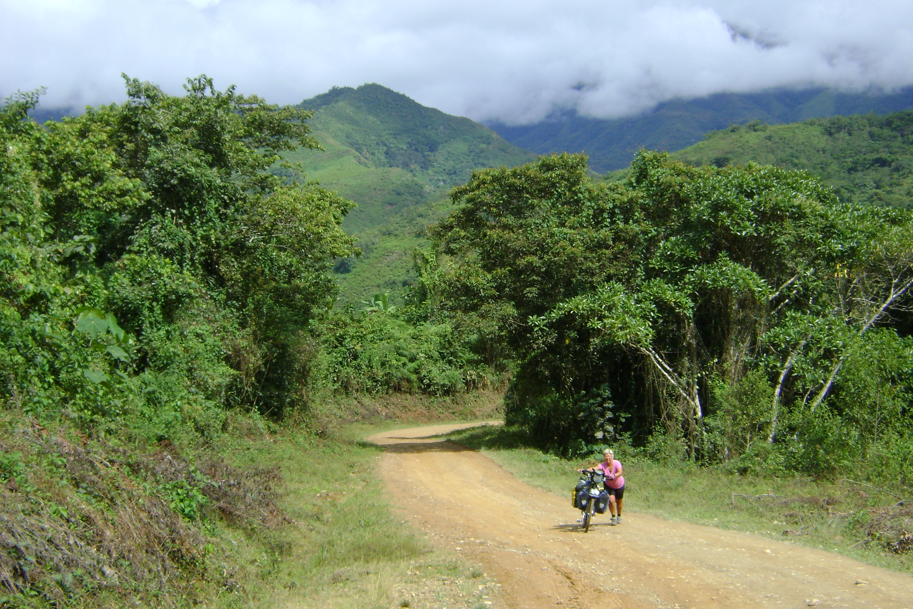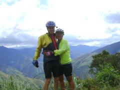 After three nights of pampering, we hopped back on the bikes and slowly rode to the Peru border. Again the steep climbs caused us to get off our bikes and push up the steep parts. The nice pavement ended after just 20 kilometers (for the next week) and the real work started. We climbed up over the continental divide somewhere in the Podocarpus National Park. The road was muddy because of the amount of rain that falls in this cloud forest. We had several stream crossings. Randy rode through them, but I changed into my sandals and walked across. Sometimes we could see foggy vistas, but sometimes the clouds limited us to views of the mossy vegetation we rode by. Tiny flowers sprung out of the cliff-hanging moss and orchids thrived in this perfect environment. We topped the climb at 2772 meters thinking we were about to descend 1000 meters into Valladolid. It was cold and windy. I dressed in all the warm clothes I had and rode hard to stay warm. We did descend just a bit, and it got a hair warmer, but it started to rain harder too.