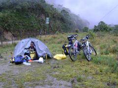 The ride was enchanting and we lost track of time in this misty wonderland as dark descended around us. Not a house or a finca was anywhere to be found. We considered setting up the tent along the graded banks of the road but we knew that camping 5 feet from the road was not optimal so we continued our search. When we crested the next climb we found a flat marshy spot under some electric wires, a safe distance from the road. As quickly as we could we set up the tent and dove in. The rain which was to this point gentle had changed its characteristic and hit us hard. We dragged all of our panniers into the vestibule of our tent and settled in for the night. Unfortunately we dragged our wet selves into a dry tent and contaminated our dry sanctuary. With wetness everywhere we did manage to sleep most of the night.