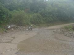 We did twice hear trucks stopping at the crest of hill and getting out. We held our breaths and listened as we heard the doors open and men´s voices appearing outside the cabs, talking and laughing. They hung around their trucks for a short while before driving away. Our little flat plateau must of been the only place to have a pit stop to relieve their bladder from the pounding of the rough, dirt, muddy road. A few cars more drove by and beeped at us. After having dinner of cold granola, we feel asleep and dreamed we would not wake up drowned rats. When we woke up in the morning the rain continued as we packed up. It seemed warmer in the morning as we put on our damp clothes. We rode on to the small town of Palanda.