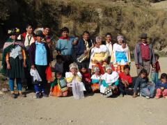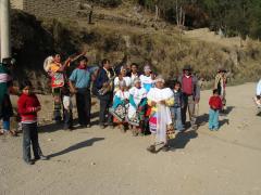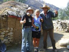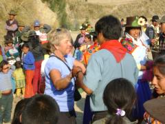 But the best part all along the way was the people we met. There were shy families along the way, tending their sheep while knitting or spinning wool into yarn. One woman let Nancy hold her most prized lamb. We ran into celebrations in three different villages. They roped us into the dancing and the eating and the drinking. It was a delight. We stayed the night camped out with a Spaniard who is "getting away from it all" with a flourish - he and a friend showed Nancy how to pan for gold - and she found a little flake of gold in the Rio Maranon! Now she's rich and can afford the rest of the trip.