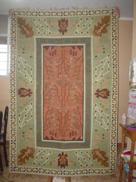 In the middle of the high Andes mountains in Peru, I roamed around a neighborhood in Ayacucho called Santa Ana. This neighborhood high up the hills is well known as an artist district with over 250 families creating Peruvian art ranging famous high-quality tapestries, stone carvings and Peruvian ceramic religious arts. I visited 6 homes. In the home of Hernan Bajalqui Tenorio, the whole extended family produces fine woven rugs from hand dyed threads. The rugs I saw ranged from 2'x3' to 5'x7'. The quality is top notch and much attention is paid to the the design, the weaving and the finishing details. I have been corresponding with Harnan on a regular basis. It is my intention to help him export this fine work. The cost is amazingly reasonable. If you are interested in purchasing any please contact me.
